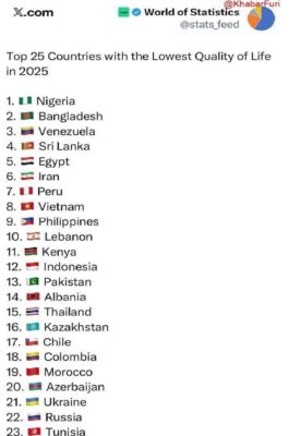 النموذج الأخير هو تلك القائمة المتداولة التي تزعم تصنيف “أسوأ 25 دولة من حيث جودة الحياة في 2025”، والتي انتشرت على أنها صادرة عن جهة عالمية مختصة، بينما هي في الحقيقة مجرد منشور مبهَم لا يستند إلى أي تقرير رسمي أو قاعدة بيانات معترف بها.