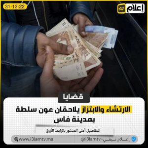 توصلت “إعلام تيفي“، أن المصلحة الولائية للشرطة القضائية بولاية أمن فاس، قد أحالت صبيحة يومه السبت، على أنظار النيابة العامة بالمحكمة الابتدائية بمدينة فاس، عون سلطة برتبة “مقدم” حضري، بعد يومين من اعتقاله لتورطه في قضية تتعلق بـ “ارتشاء وابتزاز صاحب فرن تقليدي”، قام بالتبليغ عنه بواسطة الرقم الأخضر.