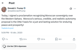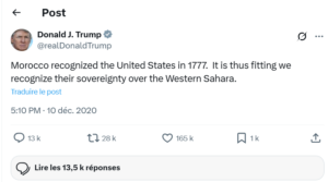 وقال ترامب في تغريدة عبر حسابه الرسمي في تويتر إنه اعترف بالسيادة المغربية على الصحراء.