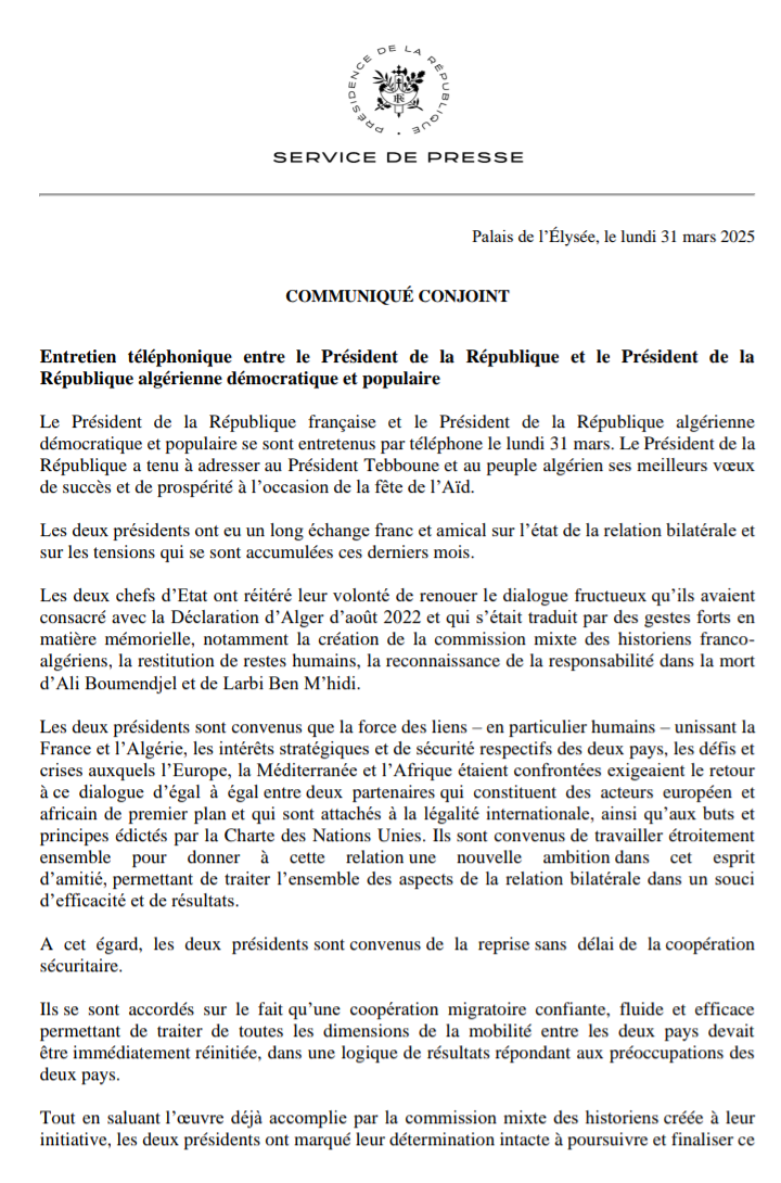 وبعد شهور من التوتر، قبلت الجزائر اتفاقًا مع فرنسا لإنهاء الأزمة بين البلدين دون أي مكاسب، بينما فرضت باريس أجندتها بالكامل.