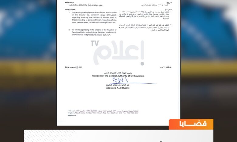 أوقفت جميع شركات الطيران العاملة بمطارات المملكة العربية السعودية، بما يشمل الطيران الخاص، العمل بما ورد في التعميم رقم ( 15598/2 ) وتاريخ 2025/01/08 م، المتعلق بشأن التأكد من حصول حاملي تأشيرات العمرة أو من لديهم الرغبة في أداء مناسك العمرة بغض النظر عن نوع التأشيرة، على لقاح الحمى الشوكية النيسيرية.