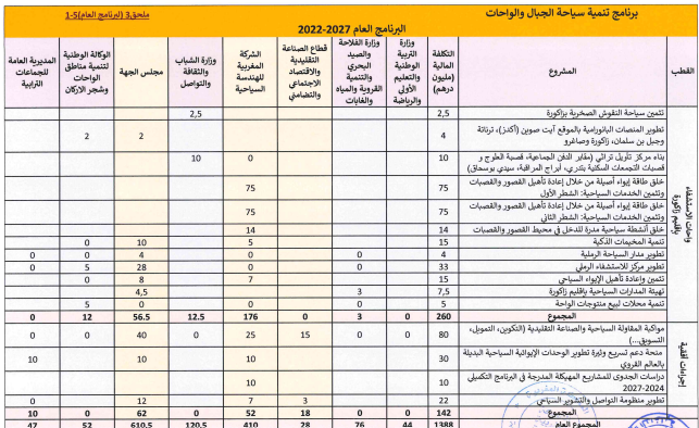 وتم توقيع الاتفاقية سنة 2022، وشملت عدة وزارات ومؤسسات، وزارة الداخلية، وزارة التربية الوطنية والتعليم الأولي والرياضة،وزارة الفلاحة والصيد البحري والتنمية القروية والمياه والغابات،وزارة السياحة والصناعة التقليدية والاقتصاد الاجتماعي والتضامني،وزارة الشباب والثقافة والتواصل، مجلس جهة درعة تافيلالت، ولاية جهة درعة تافيلالت، الوكالة الوطنية لتنمية مناطق الواحات وشجر الأركان، الشركة المغربية للهندسة السياحية، المركز الجهوي للاستثمار درعة تافيلالت.