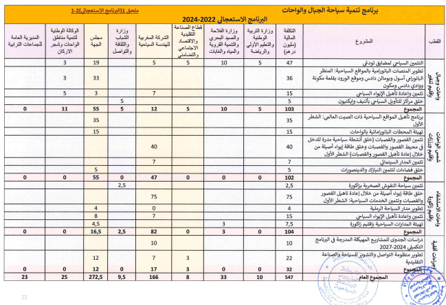 وتنقسم المشاريع إلى مرحلتين، المرحلة الأولى (2022-2024)، خصصت لها ميزانية قدرها 547 مليون درهم، وكان مجلس الجهة أكبر المساهمين بمبلغ 272.5 مليون درهم، تليه وزارة السياحة عبر الشركة المغربية للهندسة السياحية بمساهمة 166 مليون درهم.
