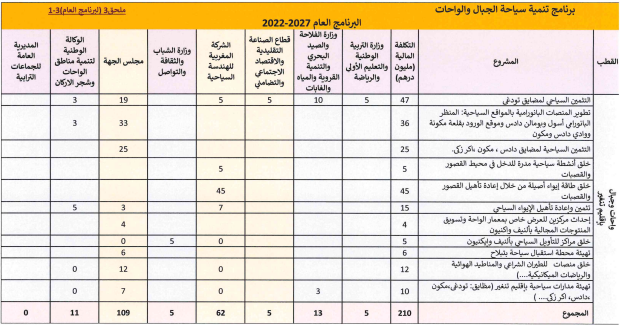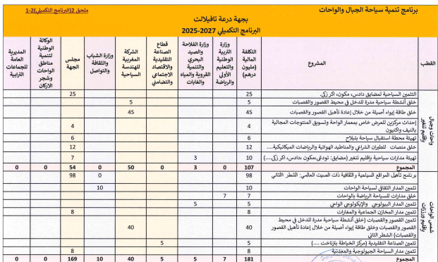 وكانت الاتفاقية تهدف إلى تحسين البنية التحتية السياحية في المناطق الجبلية والواحات، تقديم دعم مالي وتقني للمقاولات السياحية الصغيرة والمتوسطة، خلق أقطاب سياحية تنافسية تشمل مناطق الراشيدية، ورزازات، ميدلت، تنغير، وزاكورة، تطوير مدارات سياحية متنوعة مثل “حدائق الواحات”، و”شمس الواحات”، و”حصون الواحات”، وتأهيل السياحة في ضيعات الواحات وتطوير الأنشطة الرياضية والترفيهية، دعم الإيواء السياحي البديل عبر منح تصل إلى 20% من قيمة الاستثمار، توفير استشارات وتوجيه للمقاولات، وإنشاء منصة رقمية لدعم المشاريع من التصميم حتى التشغيل.