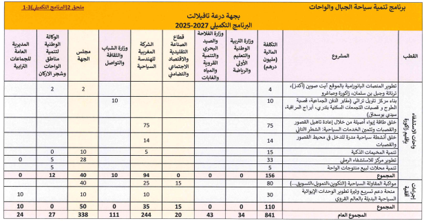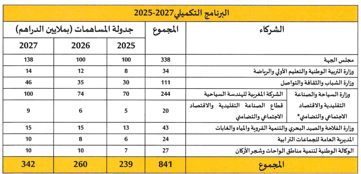 وبالنسبة للبرنامج التكميلي بغلاف مالي يناهز 841 مليون درهم والممتد من 2025 إلى 2027 لإنجاز المشاريع المهيكلة والتي يتطلب إنجازها القيام بدراسات الجدوى قبليا مع توفير الأوعية العقارية اللازمة لاحتضانها من طرف المجالس الترابية.
