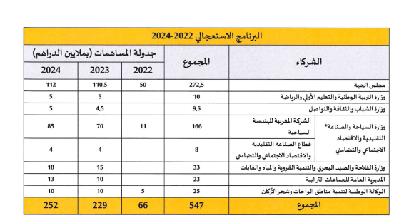 وتنقسم المشاريع إلى مرحلتين، المرحلة الأولى (2022-2024)، خصصت لها ميزانية قدرها 547 مليون درهم، وكان مجلس الجهة أكبر المساهمين بمبلغ 272.5 مليون درهم، تليه وزارة السياحة عبر الشركة المغربية للهندسة السياحية بمساهمة 166 مليون درهم.