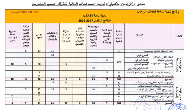 وتم توقيع الاتفاقية سنة 2022، وشملت عدة وزارات ومؤسسات، وزارة الداخلية، وزارة التربية الوطنية والتعليم الأولي والرياضة،وزارة الفلاحة والصيد البحري والتنمية القروية والمياه والغابات،وزارة السياحة والصناعة التقليدية والاقتصاد الاجتماعي والتضامني،وزارة الشباب والثقافة والتواصل، مجلس جهة درعة تافيلالت، ولاية جهة درعة تافيلالت، الوكالة الوطنية لتنمية مناطق الواحات وشجر الأركان، الشركة المغربية للهندسة السياحية، المركز الجهوي للاستثمار درعة تافيلالت.