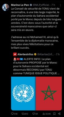 وقالت مارين لوبان : “مجلس الأمن التابع للأمم المتحدة اعترف، بأغلبية كبيرة جدًا، بمخطط الحكم الذاتي للصحراء الغربية الذي دافع عنه المغرب منذ سنوات طويلة”.