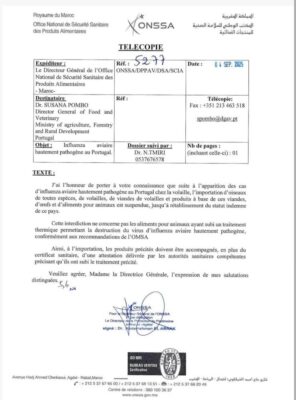 الإجراء يشمل الدواجن الحية، اللحوم، المنتجات المشتقة، البيض والأعلاف، فيما يظل مسموحاً فقط بالمنتجات التي خضعت لمعالجة حرارية كافية للقضاء على الفيروس، شرط أن تكون مرفوقة بشهادة صحية رسمية. وأوضح “أونسا”، في مراسلة رسمية إلى نظيره البرتغالي، أن هذا القرار يبقى مؤقتاً ويرتبط بتطور الوضعية الوبائية في البرتغال.
