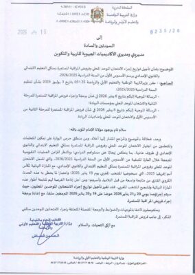 وفي مراسلة موجهة إلى مديريات الأكاديميات الجهوية للتربية والتكوين، أوضحت الوزارة أن الامتحانين الموحدين سيجرى يومي 20 و21 يناير، بدل 19 و20 يناير المقررين سابقا، مشيرة إلى أن إعادة البرمجة تهدف إلى تمكين التلاميذ من اجتياز امتحاناتهم وفروض المراقبة المستمرة في ظروف عادية، بما يضمن التركيز والتحصيل الدراسي الأمثل خلال الفترة المتبقية من الأسدوس الأول للسنة الدراسية 2025/2026.
