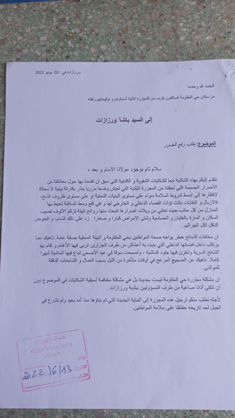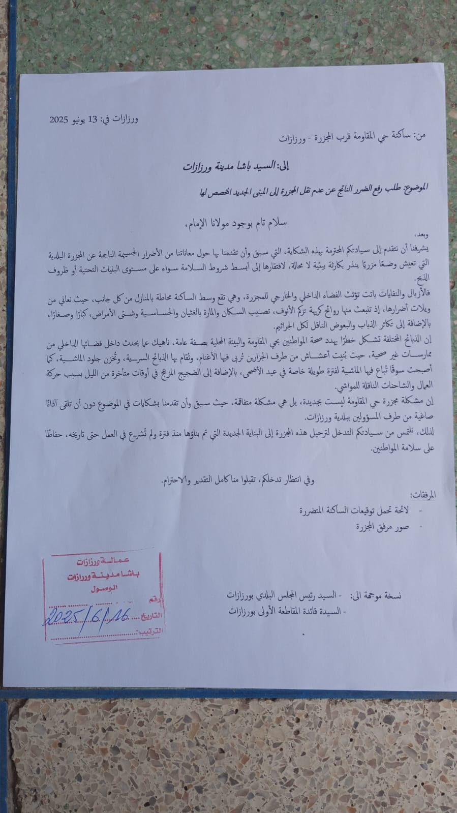 وأشار إلى أن سكان حي المقاومة وجّهوا عريضة احتجاجية إلى باشا المدينة بتاريخ 13 يونيو 2022، طالبوا فيها برفع الضرر الجسيم الناتج عن المجزرة التي تعاني من تدهور في البنية التحتية وغياب تام لشروط النظافة والسلامة. وأوضحت العريضة أن هذه المعضلة ليست جديدة، بل هي نتيجة لتجاهل المسؤولين المتعاقبين في بلدية ورزازات لشكايات الساكنة.