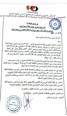 وجه المجلس الجهوي لفعاليات المجتمع المدني بجهة الشرق، مراسلة رسمية إلى والي جهة الشرق عامل عمالة وجدة أنكاد، يدعوه فيها إلى عقد لقاء استعجالي لمناقشة الوضعية المقلقة التي يعيشها قطاع النقل الحضري بمدينة وجدة.